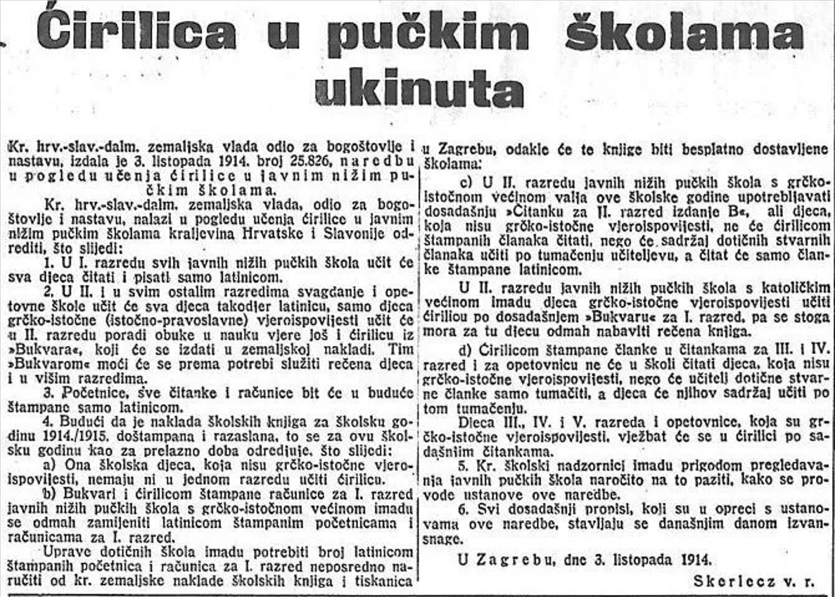 Ćirilica u pučkim školama ukinuta. U Zagrebu, dne 3. listopada 1914. Hrvatska, Dalmacija, Slavonija.