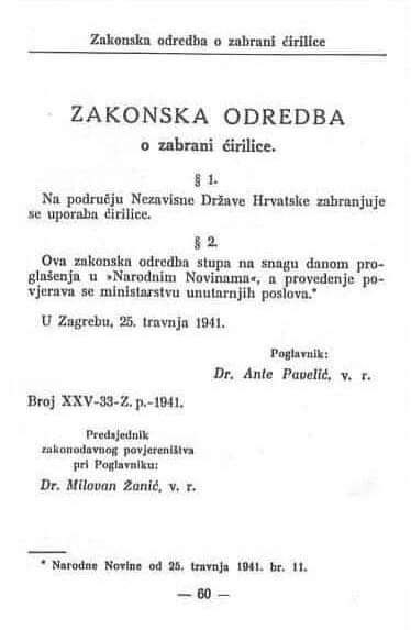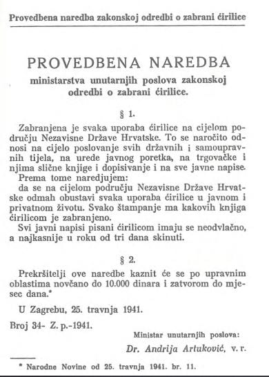 Gotovo po pravilu, prve uredbe okupatorskih vlasti su se uvek odnosile na zabranu ćirilice - toliko im je smetalo to estetski prefinjeno i lingvistički savršeno pismo.